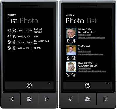 A corporate directory viewer, with a list view and a photo view. You can call or email a person by clicking on the appropriate action button.