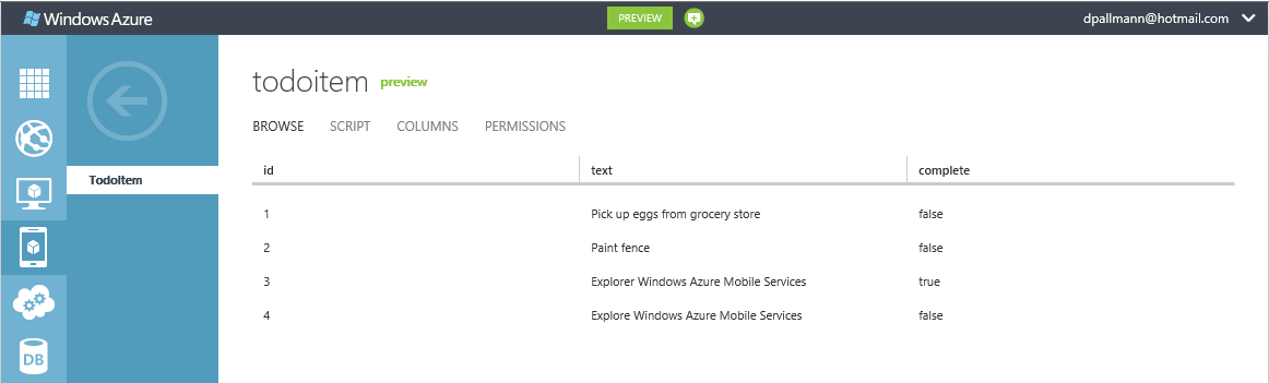 Viewing the DataWhere is the To Do data stored? In a Windows Azure SQL Database. You can view the database in the Windows Azure portal by navigating to MOBILE SERVICES > your project > DATA > your database. Here we see the items we just entered.