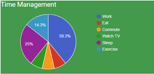 Again, very straightfoward because we're following an established pattern. With this work done, we'll update our demo.data.service.js definition of the Time Managements tile so its type is now 'pie' instead of 'donut'. After clearing cache and running the project with the Google chart provider enabled, here's what we get.